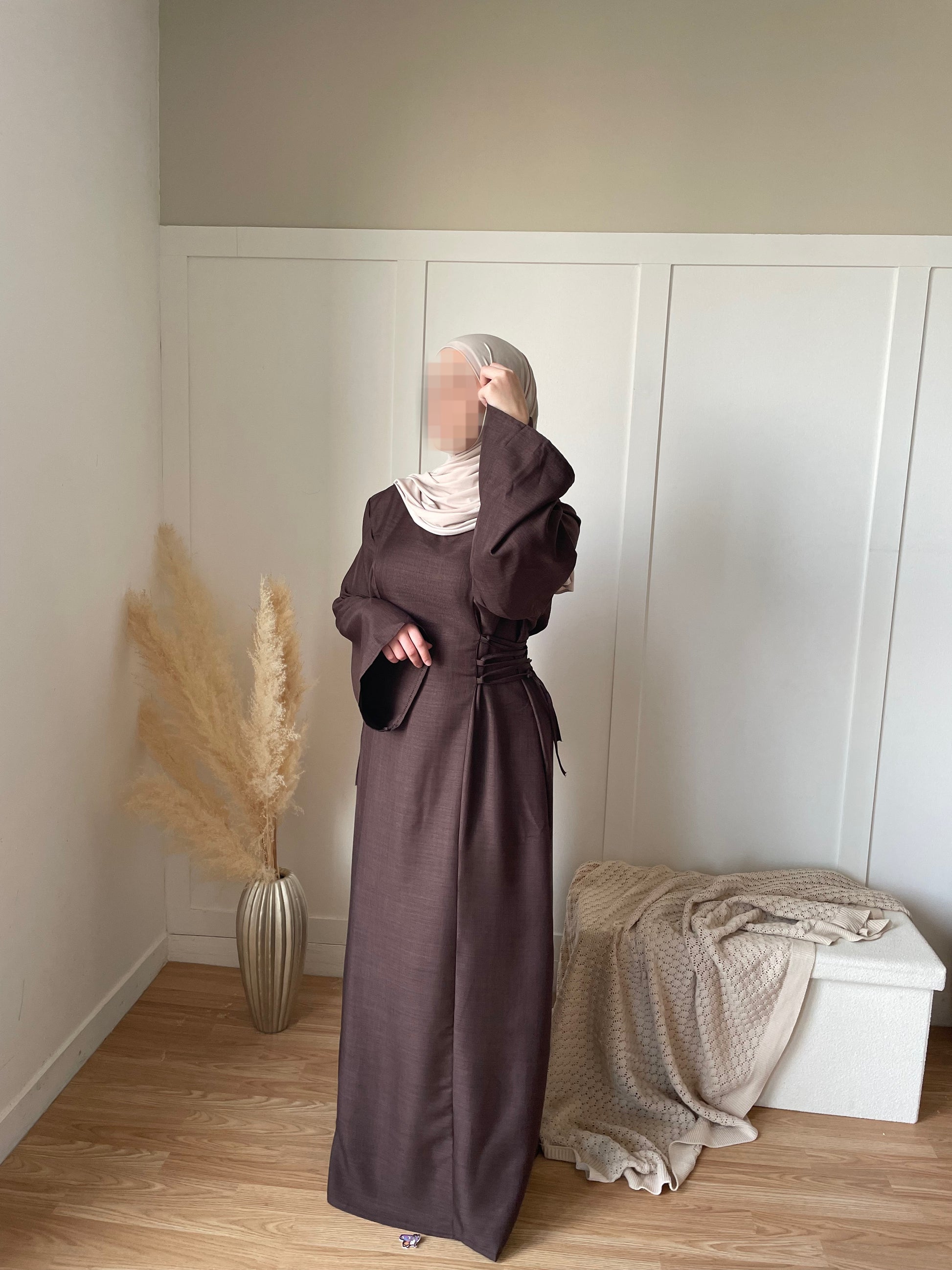 idéal pour ce printemps et cette été la abaya yara ce ressert à la taille à l’aide de lacets sur chaque côté